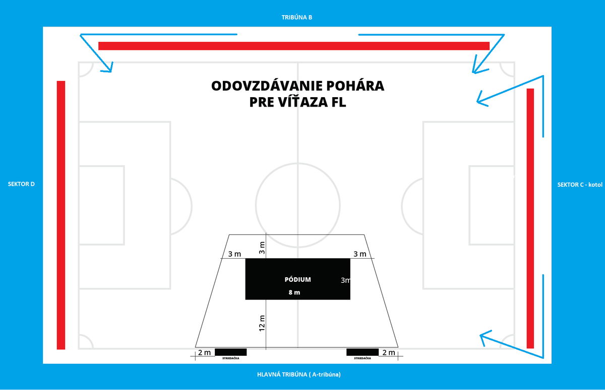 Po dokončení stavby pódia vás prostredníctvom hlásateľa vyzveme, že môžete vstúpiť na hraciu plochu. Žiadame fanúšikov, aby sa plne riadili pokynmi usporiadateľskej služby. Pozdĺž ihriska sa nachádza LED perimeter, ktorého finančná hodnota je vysoká a pri prudkých nárazoch je náchylný na poškodenie. Prosíme vás, aby ste na hraciu plochu vstupovali z rohov ihriska z priestorov mimo LED perimetra tak, ako je znázornené na mapke.